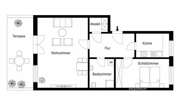 Die angebotene Wohnung im Erdgeschoss verfügt über ein Schlafzimmer, ein Wohnzimmer mit Blick auf die Terrasse und den Garten, eine abgeschlossene Küche, ein Badezimmer (Duschbad), sowie über einen praktischen Abstellraum. Ein weiterer Abstellraum befindet sich im Keller des Mehrfamilienhauses.