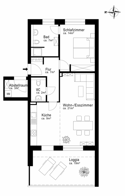 Die Grundrisspläne sind nicht zur Maßentnahme geeignet; Änderungen bleiben vorbehalten; Irrtum ist möglich; farbliche Darstellungen sowie zeichnerische Ausdrucksmittel (z. B. Möbel) gelten nicht als Baubeschreibung und nicht als Ausstattungsgegenstände.